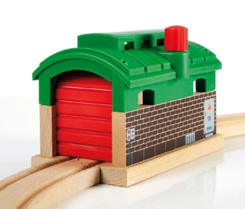 Parowozownia BRIO 33574 to pojedynczy garaż dla lokomotywy, który daje dzieciom miejsce na odpoczynek i drobne naprawy pociągów. Dzięki gałce na dachu można samodzielnie otwierać i zamykać drzwi garażu, a jeśli pozostaną otwarte, zajezdnia może służyć jako tunel, wprowadzając nowe możliwości zabawy i scenariuszy kolejowych.