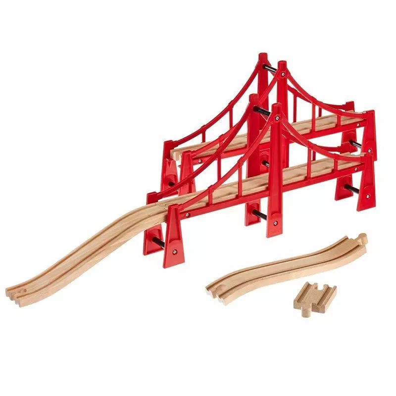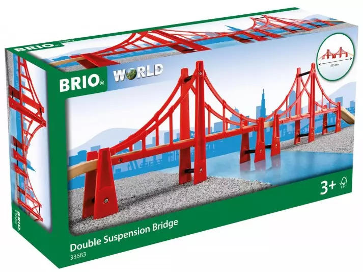 Podwójny most wiszący BRIO 33683 to najdłuższy most kolejowy w ofercie BRIO, który dzięki sześciu szerokim wspornikom zapewnia wyjątkową stabilność nawet podczas intensywnej zabawy. Most ma długość ponad 113 cm i jest ustawiony na tyle wysoko, aby pociągi, łodzie oraz inne pojazdy mogły swobodnie przejeżdżać lub przepływać pod nim. Zestaw można rozbudować, dodając dwa wznoszące się tory (sprzedawane osobno), co pozwala na stworzenie dwóch mniejszych mostów i zwiększa możliwości układania tras.