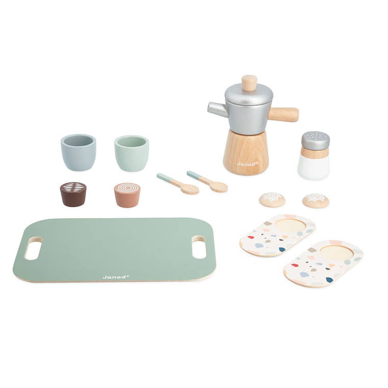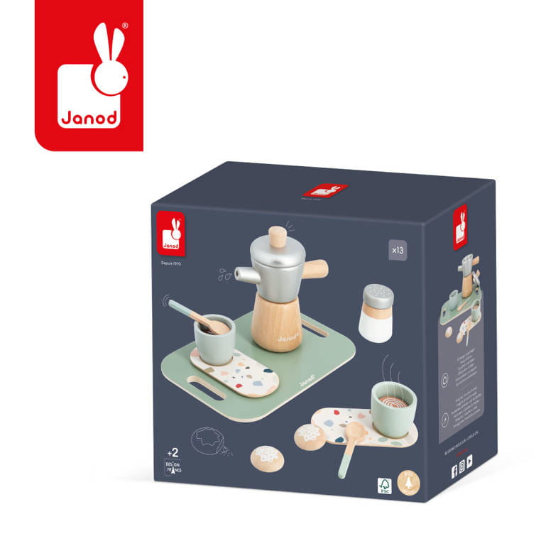 Drewniany zestaw do parzenia włoskiej kawy z serii Loft francuskiej marki JANOD składa się z 13 elementów i sprawi mnóstwo radości każdemu dziecku. Pozwoli mu bezpiecznie uczestniczyć razem z rodzicem w codziennych kuchennych czynnościach, poznawać kulinarne tajniki i rozwijać pasję gotowania. W skład utrzymanego w loftowym stylu zestawu wchodzą: 1 prostokątna taca z zaokrąglonymi rogami i otworami-uchwytami, 1 kawiarka, 1 dozownik cukru, 2 proste filiżanki, 2 podłużne spodki ze wzorem lastriko, 2 małe łyżeczki, 2 rodzaje kawy (cappuccino i czarna) i 2 biszkopciki z lukrem. Zestaw stanowi świetne uzupełnienie każdej dziecięcej kuchni.