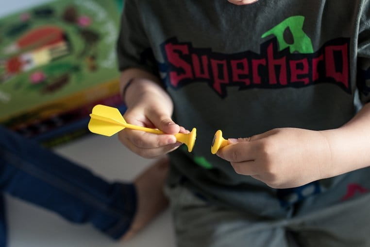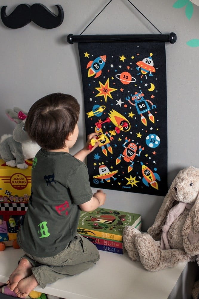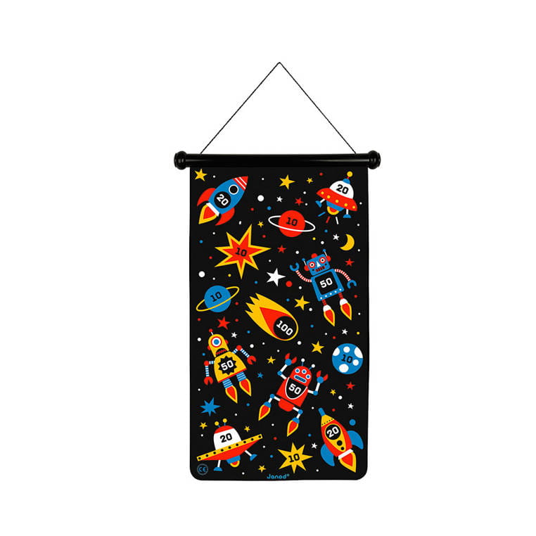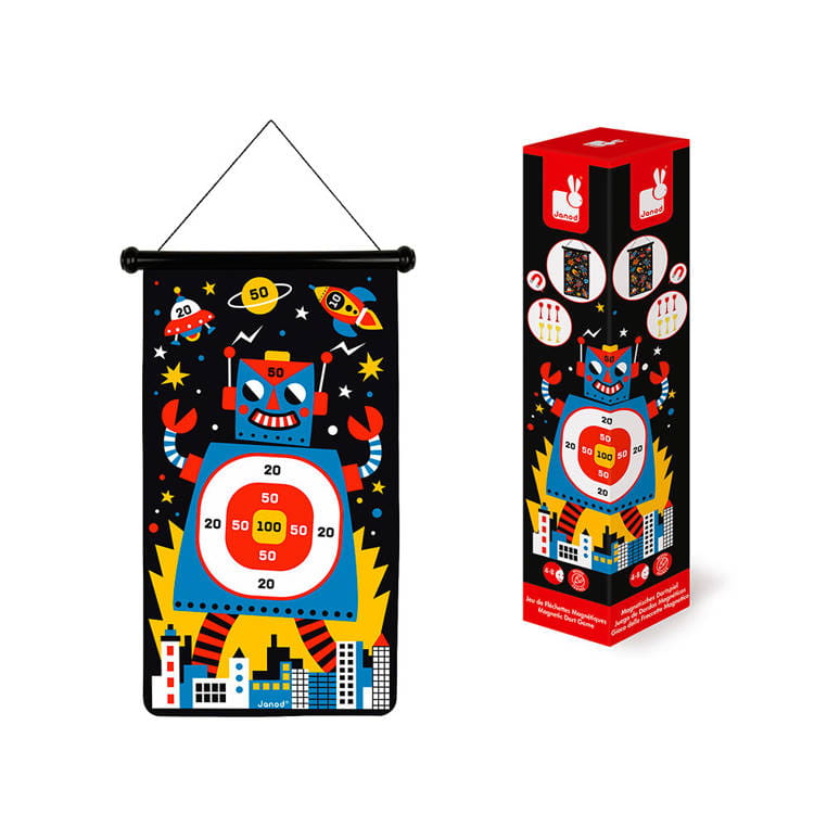 Magnetyczna gra w rzutki Roboty francuskiej marki JANOD to wspaniała zabawa dla dwojga – zarówno dzieci, jak i ich rodziców. Zestaw składa się ze zwijanej na rolkę tarczy ze sznurkiem do jej zawieszenia np. na ścianie oraz z 6 magnetycznych rzutek w dwóch kolorach (3 czerwone i 3 żółte). Czarna tkanina tarczy ilustrowana jest dwustronnie postaciami kolorowych robotów i innymi kosmicznymi motywami. Rzutkami należy celować w tarczę z odpowiedniej, ustalonej przez graczy odległości, w taki sposób, by trafić w oznaczone na niej punktowane miejsca.