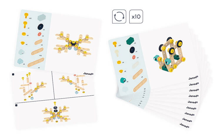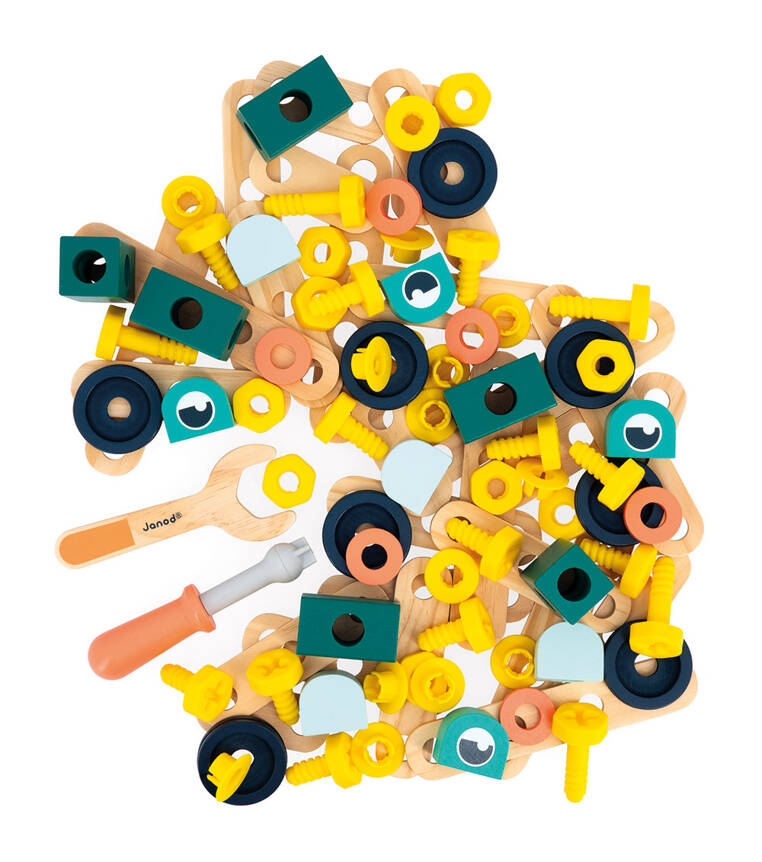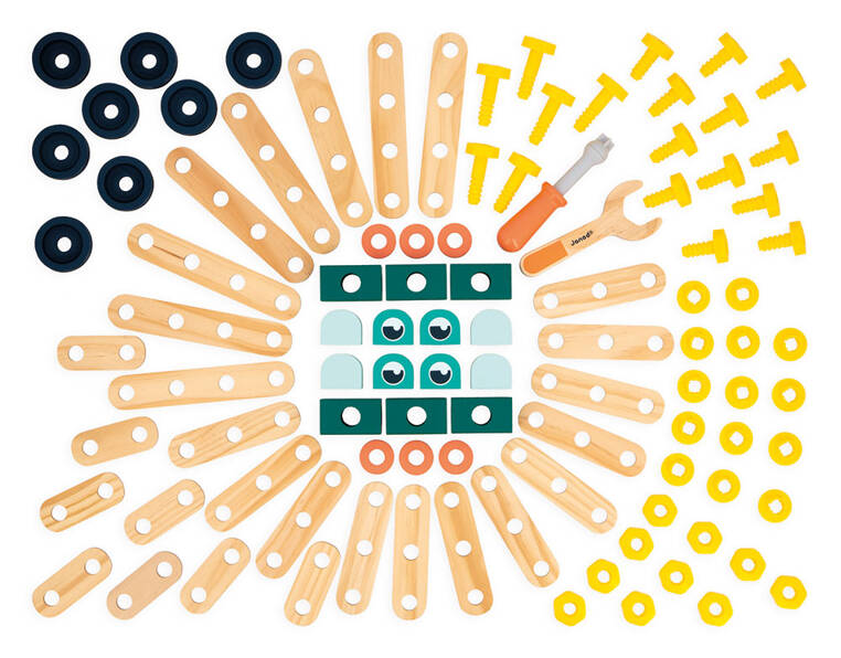 100-elementowy zestaw konstruktora z kolekcji Brico'kids francuskiej marki JANOD to idealny prezent dla małego majsterkowicza. Dzięki różnorodnym drewnianym elementom zabawka wspomaga rozwój dziecka na wielu płaszczyznach: rozwija zdolności manualne, cierpliwość, koncentrację, a także stymuluje wyobraźnię i umiejętności społeczne, zachęcając do odgrywania scen, imitujących zachowanie dorosłych. W skład zestawu wchodzą: elementy drewniane, elementy plastikowe (podkładki, nakrętki, śrubki) oraz śrubokręt i klucz. Dołączono do niego również 10 kart z propozycjami konstrukcji do zbudowania. Dzięki sporej ilości akcesoriów zabawką może bawić się jednocześnie więcej niż jedno dziecko. Zestaw zaprojektowany został we Francji. Zapakowany jest w estetyczne pudełko. Idealnie nadaje się na prezent.