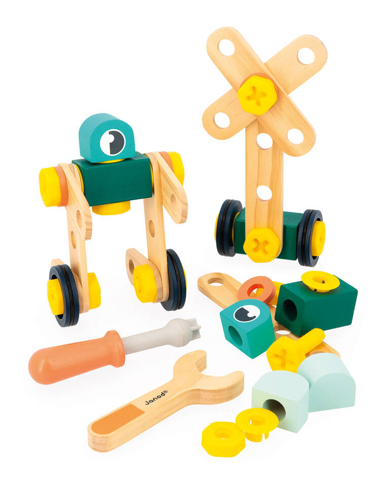 50-elementowy zestaw konstruktora z kolekcji Brico'kids francuskiej marki JANOD to idealny prezent dla małego majsterkowicza. Dzięki różnorodnym drewnianym elementom zabawka wspomaga rozwój dziecka na wielu płaszczyznach: rozwija zdolności manualne, cierpliwość, koncentrację, a także stymuluje wyobraźnię i umiejętności społeczne, zachęcając do odgrywania scen, imitujących zachowanie dorosłych. W skład zestawu wchodzą elementy drewniane, elementy plastikowe (podkładki, nakrętki, śrubki), 4 gumowe kółka oraz śrubokręt i klucz. Dołączono do niego również 10 kart z propozycjami konstrukcji do zbudowania. Dzięki sporej ilości akcesoriów zabawką może bawić się jednocześnie więcej niż jedno dziecko. Zestaw zaprojektowany został we Francji. Zapakowany jest w estetyczne pudełko. Idealnie nadaje się na prezent.