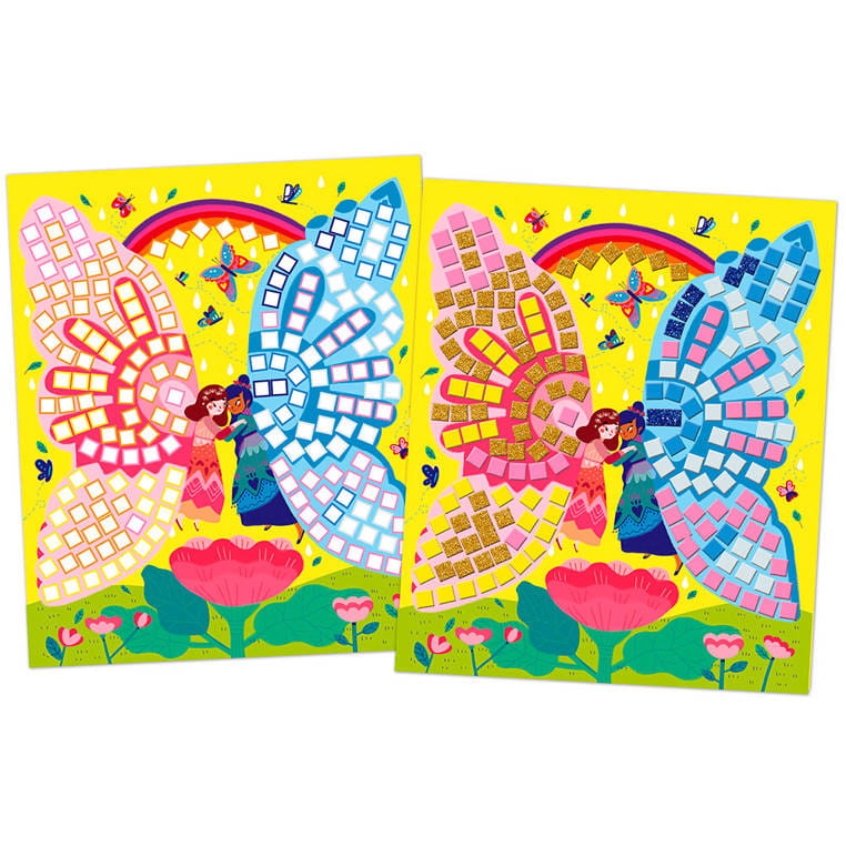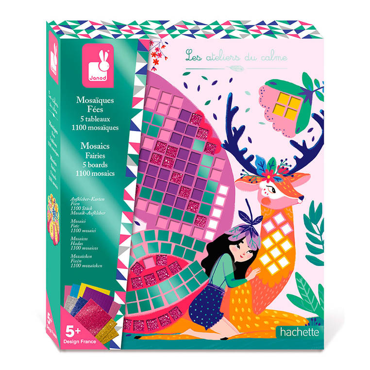 Zestaw kreatywny Mozaika Wróżki francuskiej marki JANOD zawiera 5 kartonowych plansz-obrazków, które przedstawiają uskrzydlone wróżki wśród kwiatów, magicznych stworzeń, a nawet – na księżycu. Do ilustracji tych można – zarówno w sugerowanych miejscach, jak i dowolnie – przyklejać dołączone do zestawu drobne kwadratowe piankowe naklejki w 10 różnych kolorach (każdy na osobnym arkuszu), w tym 4 z efektem połysku. Naklejanie to dla dziecka długie godziny angażującej i jednocześnie uspokajającej, wyciszającej zabawy, a gotowe obrazki staną się wspaniałym elementem dekoracyjnym dziecięcego pokoju.