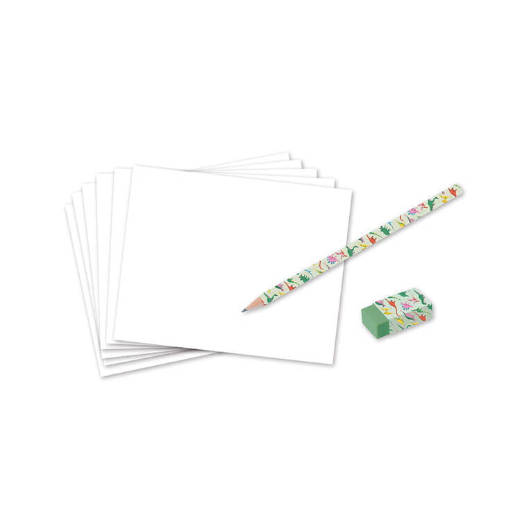 Zestaw kreatywny Rysowanie krok po kroku Dinozaury francuskiej marki JANOD zawiera 20 plansz ze wzorami do odwzorowania krok po kroku, 25 pustych kartek, ołówek HB i gumkę do zmazywania. Rysunki do odtworzenia przedstawiają różne gatunki dinozaurów. Nauka rysunku krok po kroku to wiele godzin angażującej i jednocześnie uspokajającej, wyciszającej zabawy, a gotowe obrazki staną się wspaniałą dekoracją dziecięcego pokoju i powodem do dumy dla małych artystów.