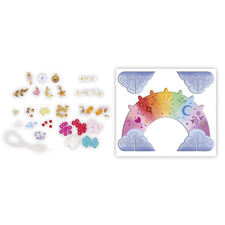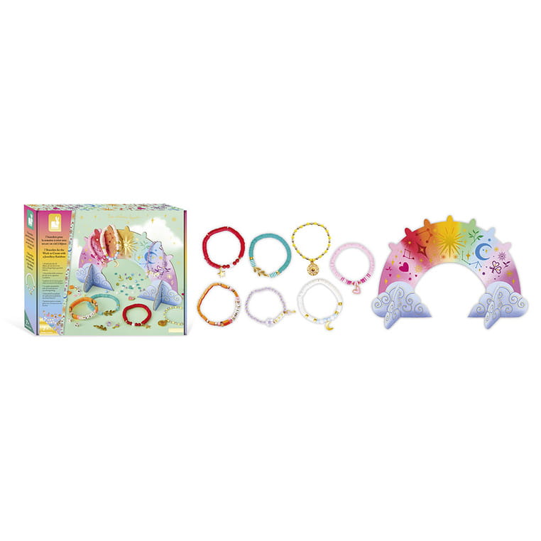 Zestaw kreatywny do tworzenia biżuterii Bransoletka na każdy dzień tygodnia francuskiej marki JANOD pozwoli stworzyć w sumie aż 7 sztuk ozdób. W jego skład wchodzi wiele koralików różnej wielkości, kolorów i kształtów (m.in. heishi czy z literkami, pozwalającymi ułożyć napisy SMILE i BFF) oraz 6 zawieszek: gwiazda, księżyc, serce, słońce, klucz i gałązka z liśćmi. Ponadto w zestawie jest długa elastyczna nitka oraz tęczowy stojak na gotowe bransoletki do złożenia z kartonowych elementów. W kilka chwil Twoje dziecko może stać się kreatywnym jubilerem! Projektowanie i tworzenie biżuterii to godziny angażującej i jednocześnie uspokajającej, wyciszającej zabawy, a po skończonej pracy powstałe dzieła mogą jeszcze długo służyć jako ozdoby lub podarunki dla bliskich. Do zestawu dołączona jest szczegółowa instrukcja jak wykonać poszczególne ozdoby.