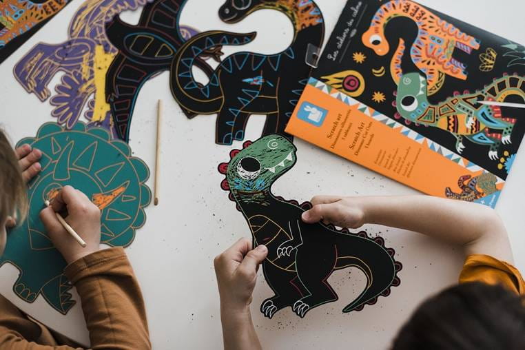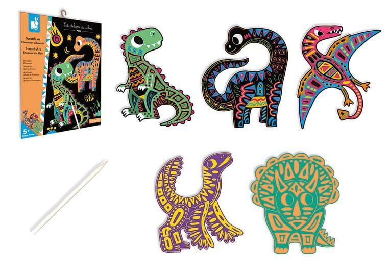 Zestaw kreatywny Do zdrapywania Dinozaury francuskiej marki JANOD zawiera 5 dinozaurów z solidnego kartonu. Postacie są czarne, jedynie z kolorowymi konturami elementów, które ukazują się stopniowo w efekcie zdrapywania wierzchniej warstwy. Do zestawu dołączony jest plastikowy patyczek do zdrapywania. Zdrapywanie to dla dziecka długie godziny angażującej i jednocześnie uspokajającej, wyciszającej zabawy, a gotowe figurki staną się wspaniałą dekoracją dziecięcego pokoju.