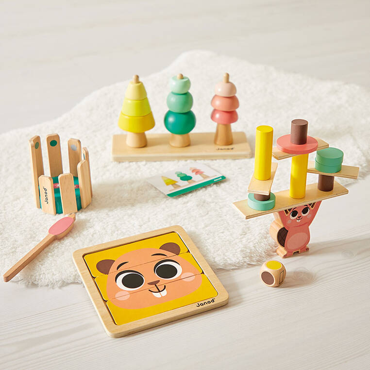 Box z zestawem zabawek edukacyjno-rozwojowych francuskiej marki JANOD przeznaczony jest dla dzieci od 36. miesiąca życia. Został opracowany stosownie do wieku we współpracy z terapeutą psychomotorycznym, aby wspierać rozwój intelektualny oraz świadomość pierwszych zasad zabaw czy gier. W jego skład wchodzi: