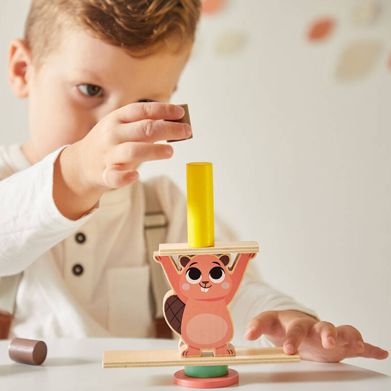 • zabawka zręcznościowa: bóbr do układania na nim elementów, wyrzuconych na kostce (w odpowiednim kolorze) lub wg własnego pomysłu – ćwiczy logikę, planowanie, małą motorykę i zręczność;
