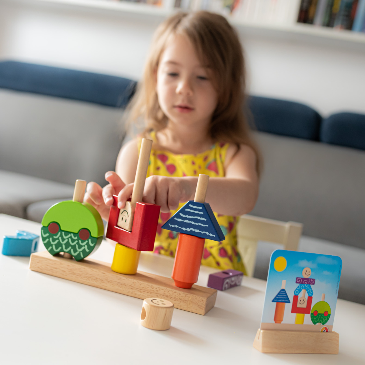 Żadne wyzwanie nie jest straszne, gdy masz pod ręką radosne, drewniane klocki! Ułóż konstrukcję tak, aby zachwyciła precyzją wykonania i była zgodna z wybraną kartą zadania. Pamiętaj, że to, co oświetlone promieniami słońca, jest czytelne i pełne barw – dzięki temu łatwiej odwzorujesz ilustrację.