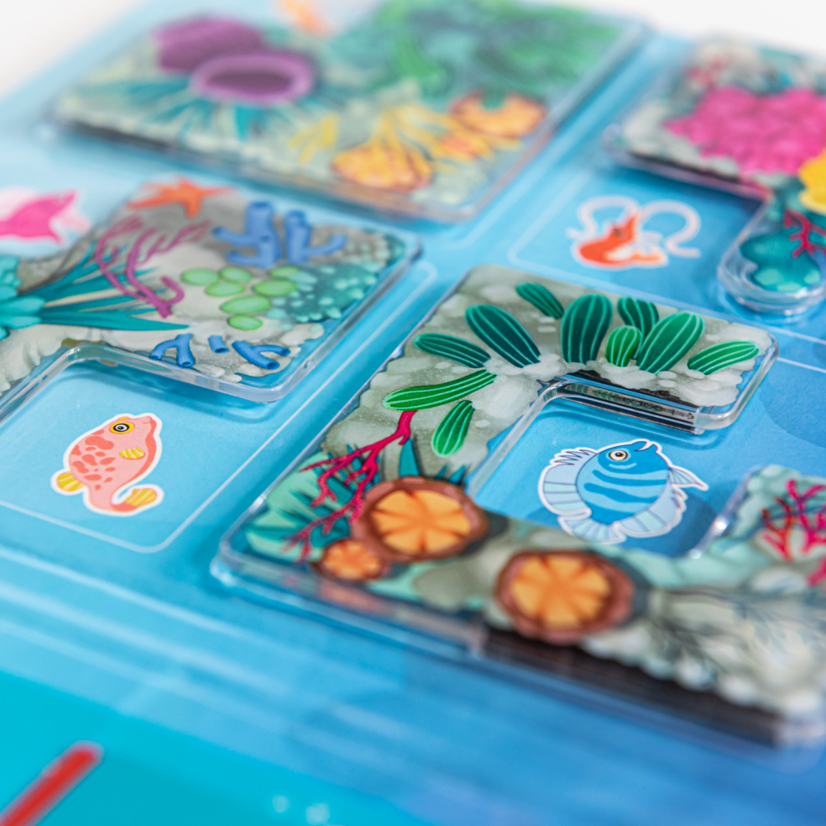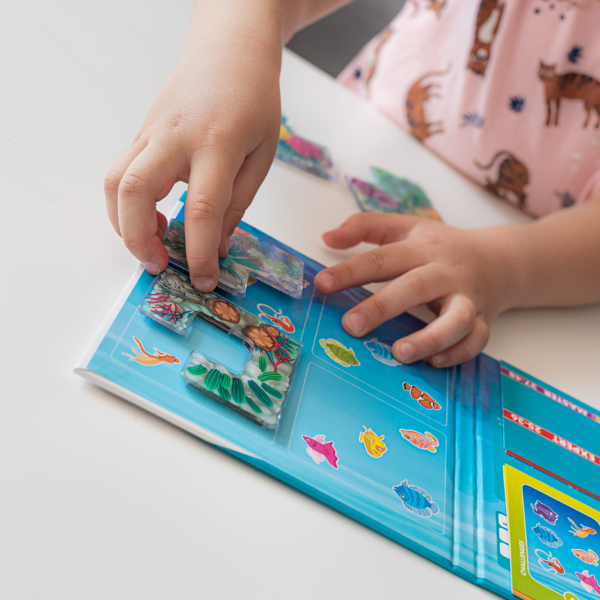 Pobaw się w chowanego pod wodą! Wskocz między rafy koralowe i razem z kolorowymi rybkami baw się w chowanego! Czy uda Ci się rozwiązać każde z zadań i ukryć rybki, które nie są wskazane w zadaniu? Obserwujcie, jakie zwierzęta zamieszkują bajeczną rafę. Ale uważajcie, niektóre z nich są bardzo nieśmiałe i chcą czym prędzej ukryć się za magnetycznymi elementami. Aby prawidłowo rozwiązać zadanie, na planszy pozostawcie widoczne tylko zwierzątka pokazane w poleceniu. Razem z pewnością Wam się uda!