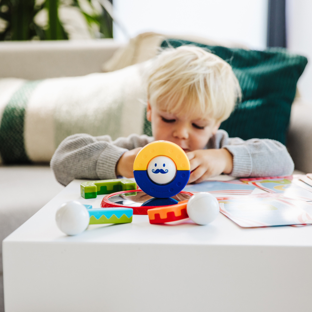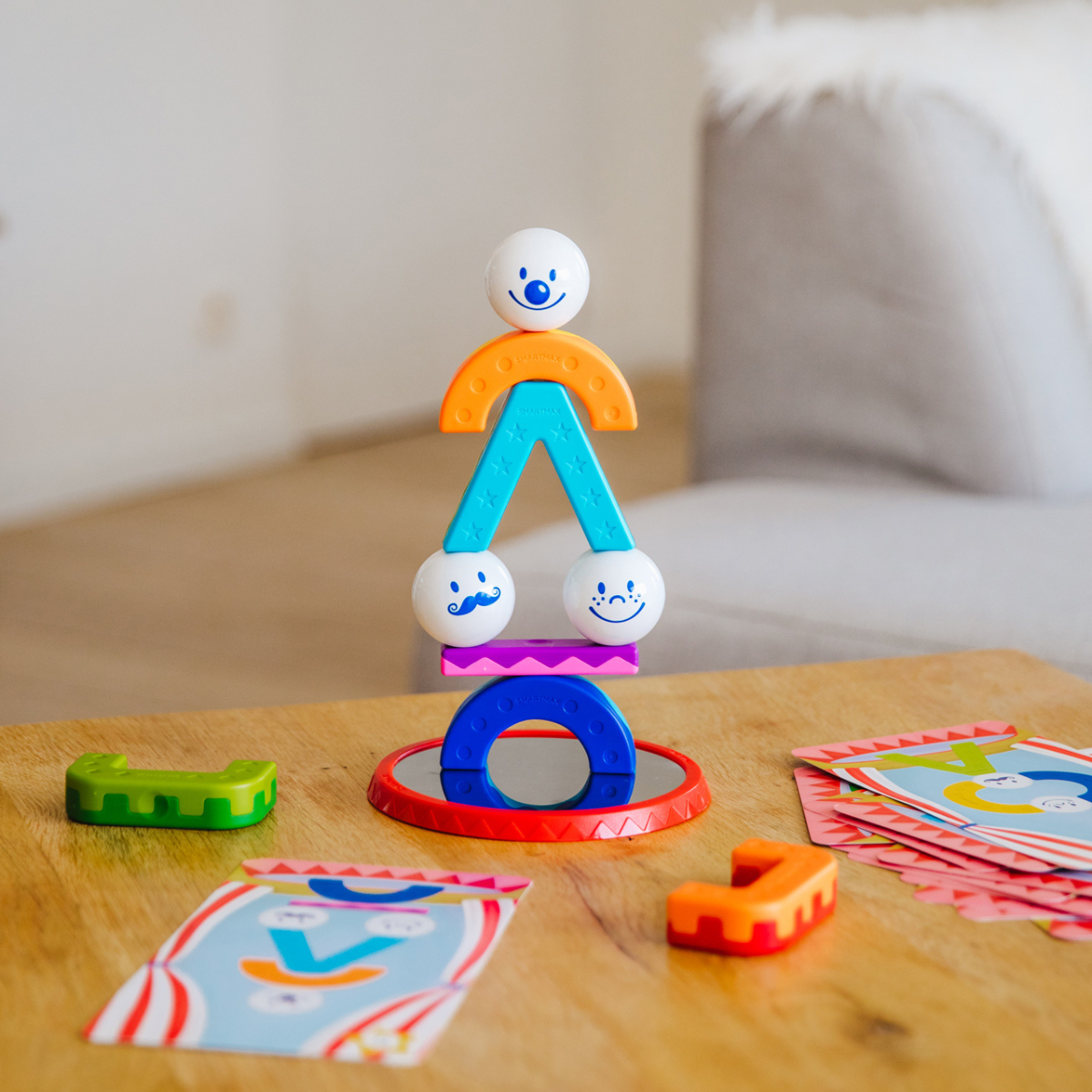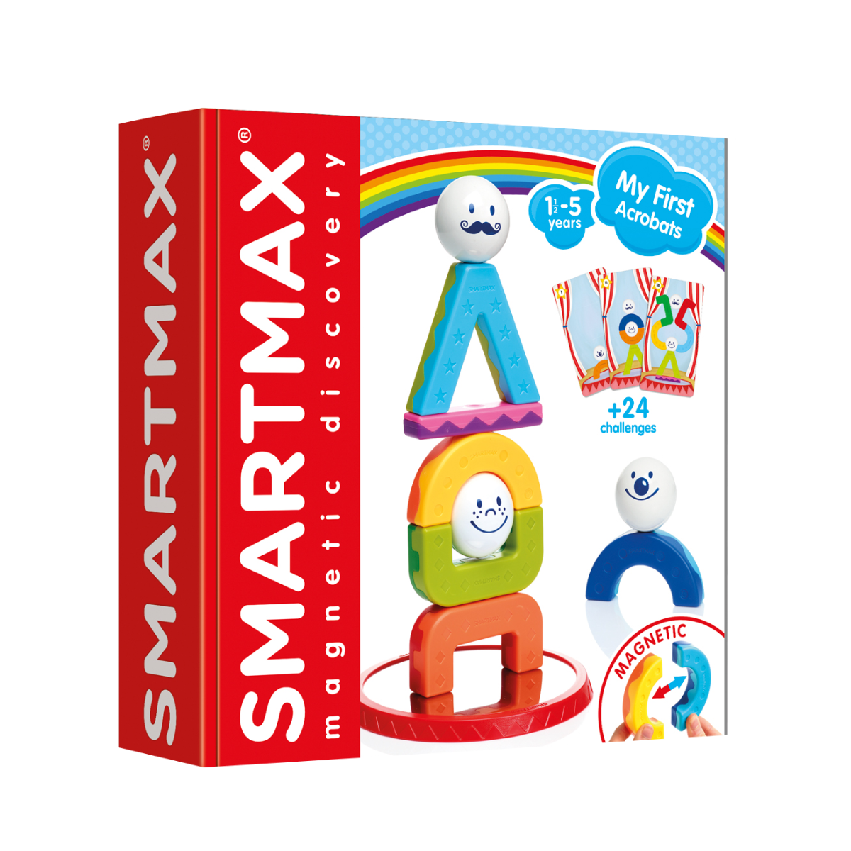 SmartMax My First Acrobats to zestaw 6 kolorowych, geometrycznych klocków konstrukcyjnych i 3 metalowych kulek, każda z inną twarzą oraz lustrzana podkładka. Zestaw zawiera 24 duże i wytrzymałe karty z obrazkowymi zadaniami, które zachęcą każde dziecko do rozwijania umiejętności poznawczych dzięki kreatywnej zabawie. My First Acrobats doskonale wspomaga naturalną kreatywność i ciekawość każdego dziecka. Maluchy pokochają tworzenie najwspanialszych konstrukcji akrobatycznych!